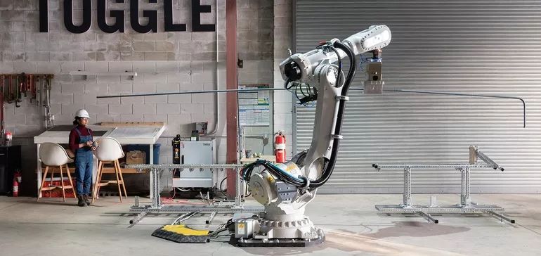 美国Toggle使用工业机器人制造和组装钢筋笼。通过协作过程,机器人可以拾取并操纵钢筋,而人工完成最后的扎线工作,与传统的生产和组装方法相比,全栈式机器人和自动化系统(也称为Toggle)可以将人工成本降低50%,生产率提高五倍,而且更安全。它是专为使用现浇以及预制钢筋混凝土产品的城市和民用基础设施项目而设计的,并且可以预先捆绑长达25英尺的笼子尺寸。