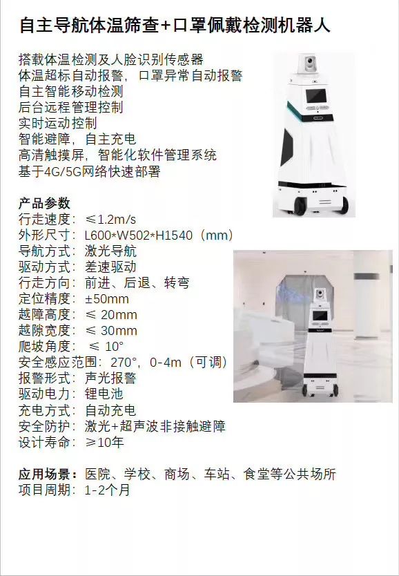 在密闭的空间里,病毒交叉感染的可能性会增加,新型的智能测温口罩检测机器人可以缓解疫情期间人手较少、物资紧缺难题,24小时不间断工作,避免交叉感染,保障人员安全。