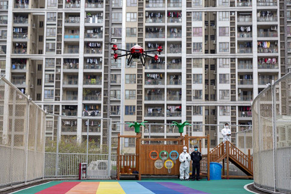 极飞农业无人机则在楼顶起飞对楼顶运动场、种植区、中间楼层进行消杀,从而得到更高的效率和更广的消杀覆盖面积。通过将消毒药物液化成微米级的颗粒,从空中向下喷洒,形成网状雾液,并通过气溶胶在空气中悬浮弥漫,对空气进行消毒。