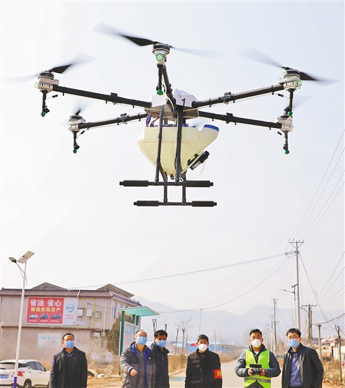 2月13日,一家养殖合作社用无人植保机在山东省沂南县依汶镇王家庄子村实施防疫消杀。 杜昱葆摄(中经视觉)