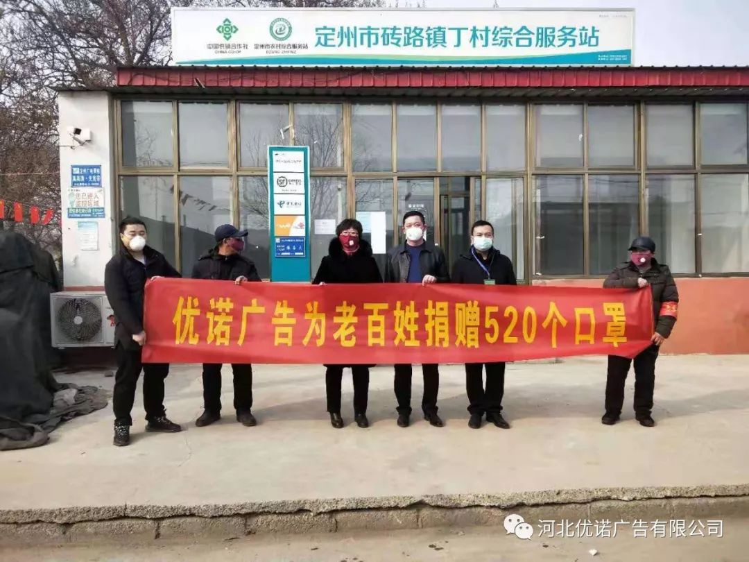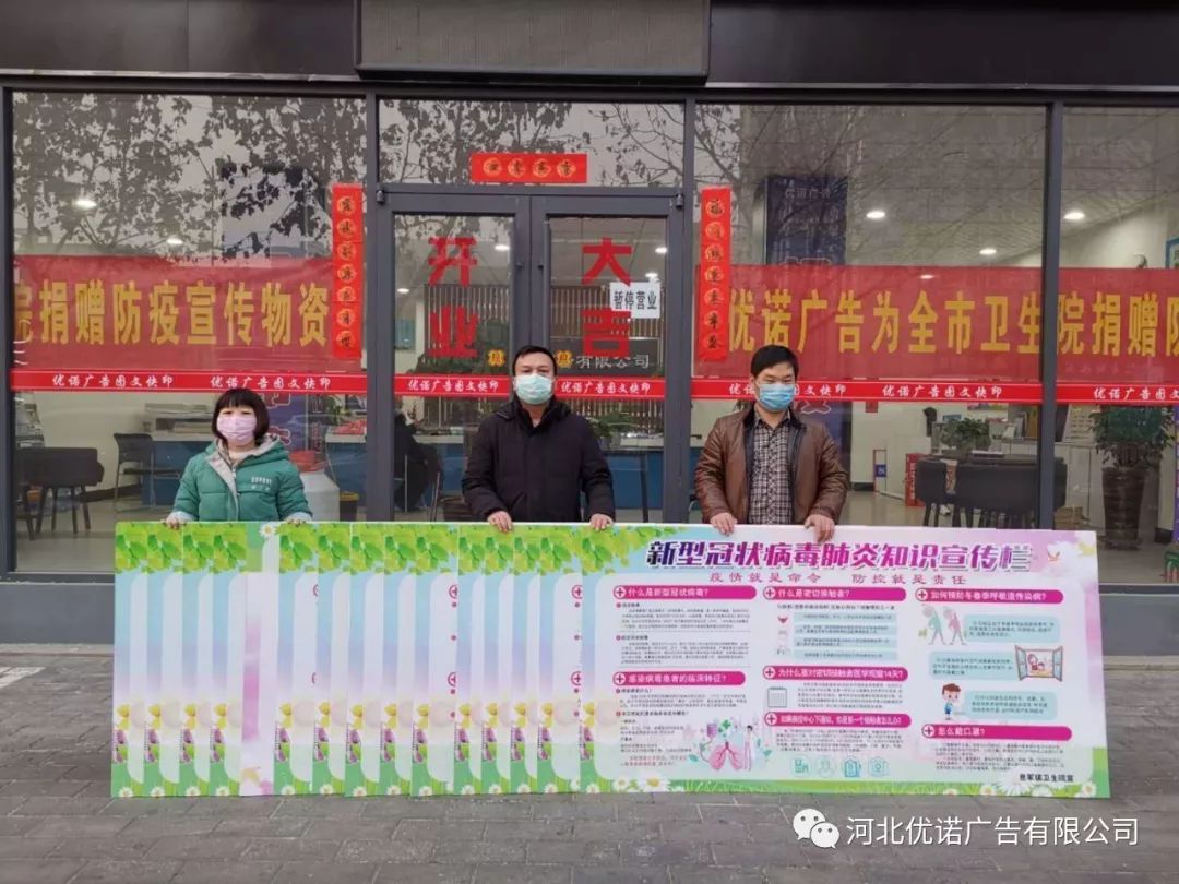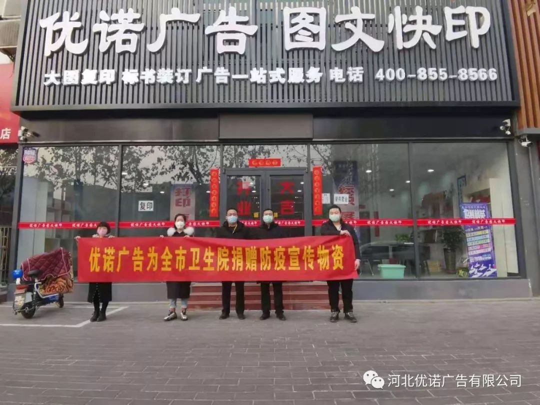 在这种特殊情况下,河北优诺广告有限公司总经理携全体员工为守护城市的英雄们敬献上一份爱心,为家乡的父老乡亲做出一份贡献。