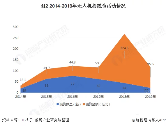 从2014-2019年无人机领域的投融资活动来看,2016年,民间的投资数量达到近六年来的峰值水平,投资热度较大,民间资本活跃;2018年投资金额达到峰值,总投资金额高达224.3亿元,大型投资机构纷纷进入,市场火爆,2019年投资热度和金额持续下滑,发展受限。