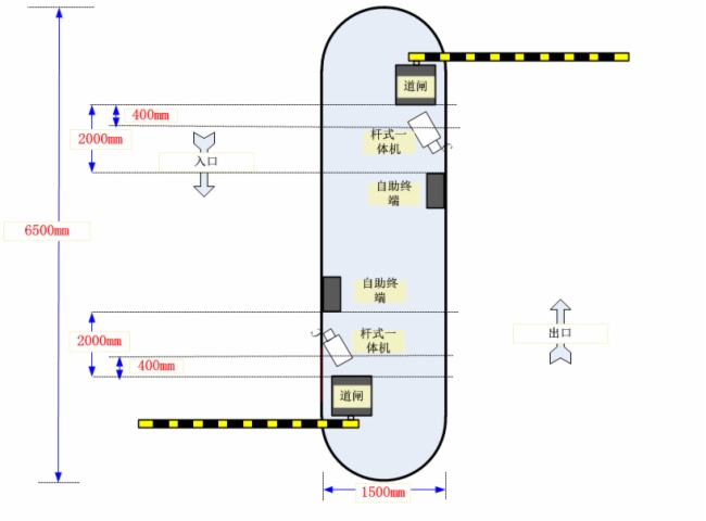 ●入口(出口)道闸边侧与入口(出口)自助终端间距2000mm;