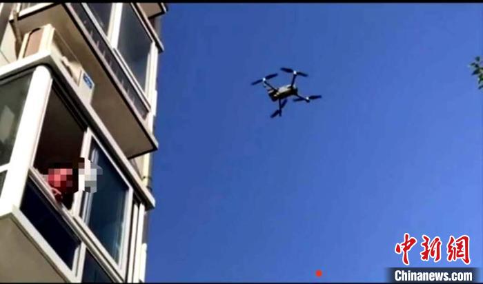 无人机高空为隔离人员测体温。 乔欢 摄