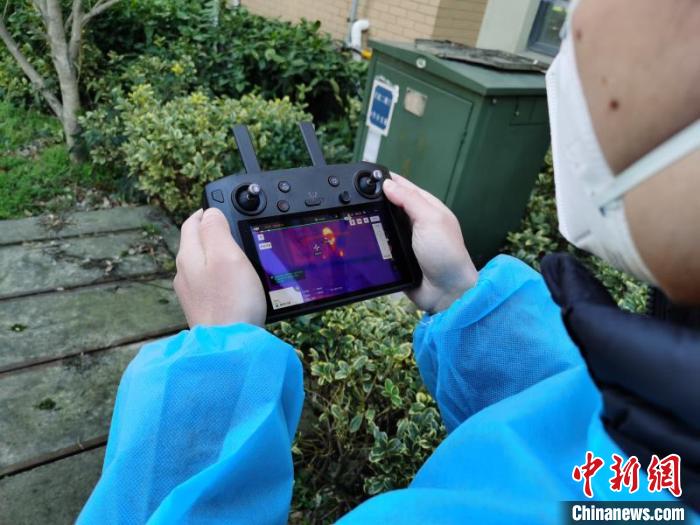 运输物资结束,志愿者团队马不停蹄地前往奉贤金汇镇另一个小区,执行新任务——为住在高层的隔离人员测温。只见,无人机飞行到指定楼层,喇叭呼叫,隔离人员站到窗口,在镜头前待两秒钟,无人机就完成了测温。 操作无人机的工作人员直接在显示屏上观测到结果。