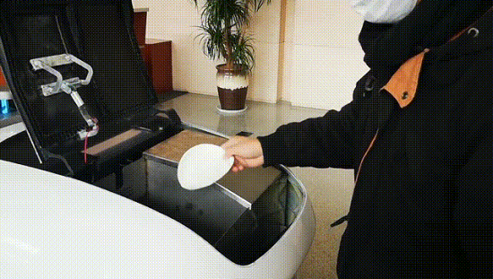 工作人员正在为机器人添加消毒粉
