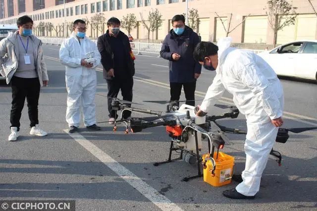 ↑2020年2月9日,在河南省汝南县古塔街道三里店社区,衡会(左二)和同事在准备实施无人机防疫消杀作业。