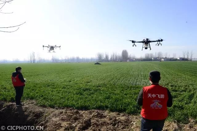 ↑2020年2月18日,在河南省汝南县三桥镇沙口村,衡会和同事操作的无人机在麦田喷洒除草剂。