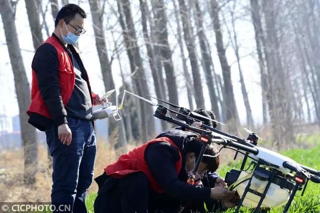 ↑2020年2月18日,在河南省汝南县三桥镇沙口村,衡会(左)和同事在准备实施无人机除草作业。