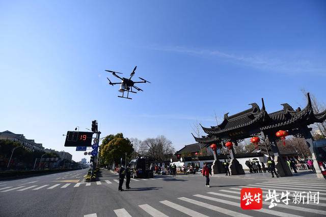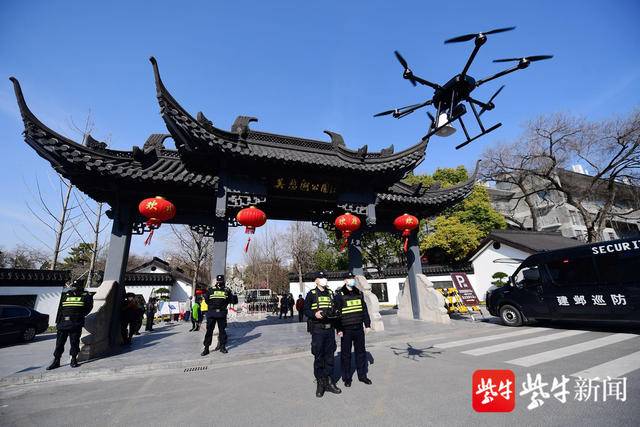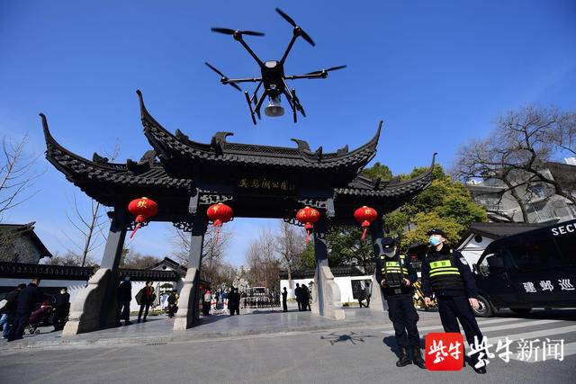 2月19日起,南京各景区逐步有序开放。南京建邺警方为同步做好安全保障工作,组织警力加强值守,并出动无人机开展景区高空巡查。