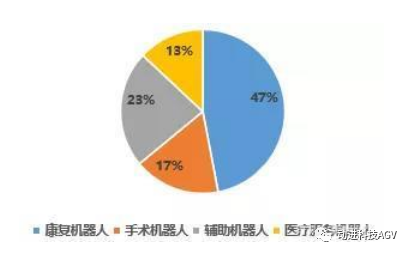 从市场结构来看,康复机器人占比最高为47%;辅助机器人占比为23%;手术机器人占比为17%;医疗服务机器人占比为13%。
