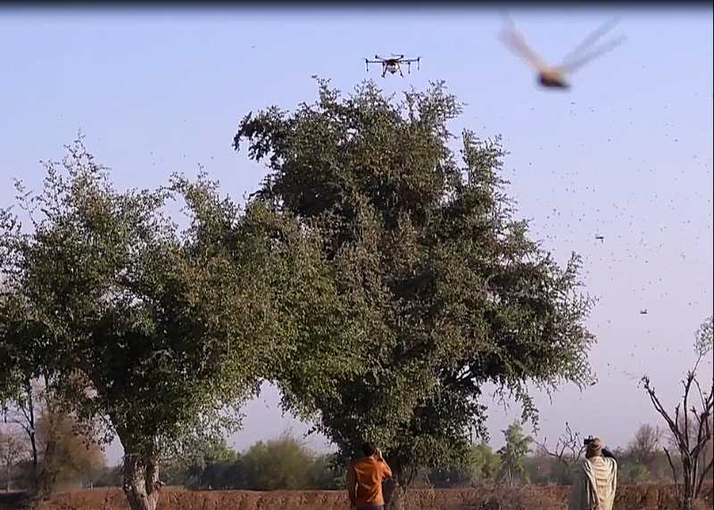 2月16日,在巴基斯坦德拉伊斯梅尔汗(dera IsmailKhan)地区,当地民众启用赛为智能多旋翼植保无人机,用于当地蝗虫灾害的防治工作。