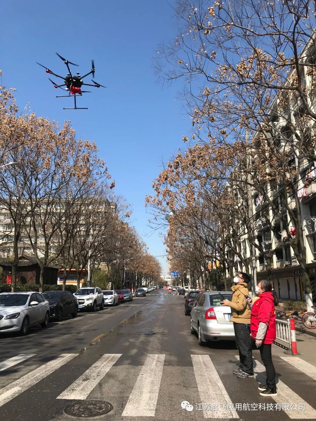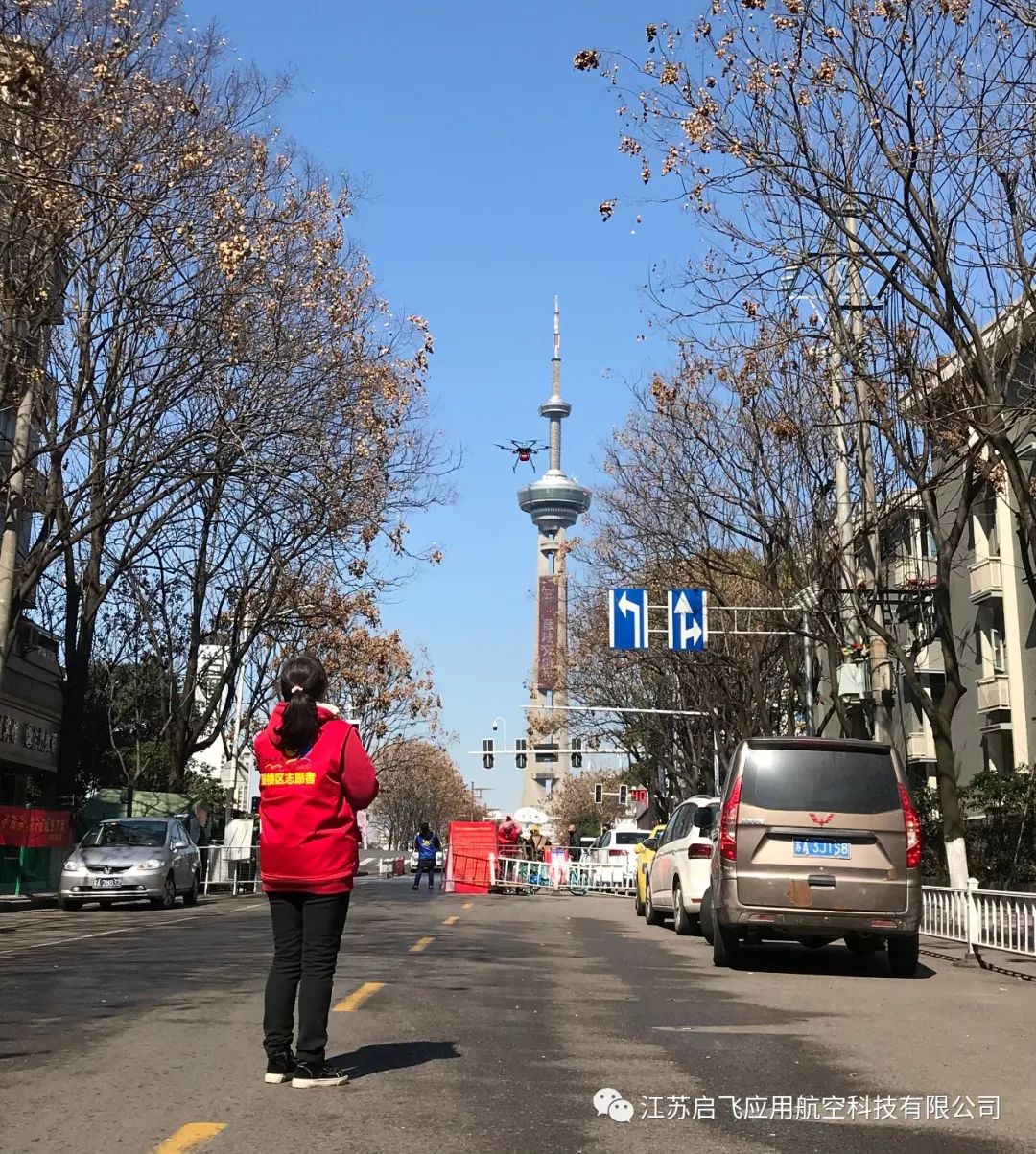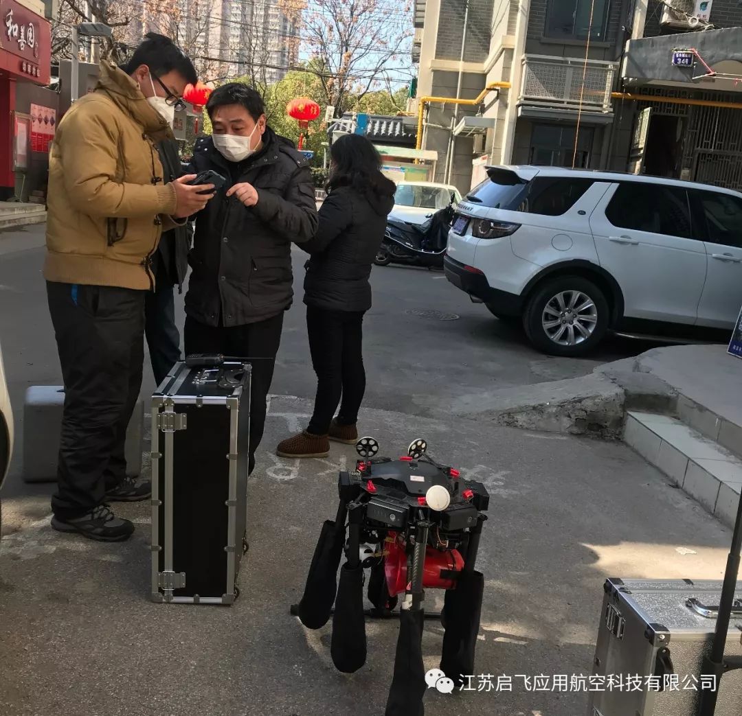 2020年2月18日下午12:30,江苏启飞无人机专业飞行人员,在南京市鼓楼区华侨路街道石头城社区主任带领下,以志愿者身份参与鼓楼区街道防疫宣传,对小区居民进行防疫工作宣传喊话,社区巡逻拍摄,共计6个架次,飞行时间约2小时。
