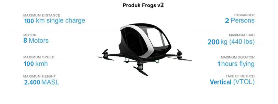 印度尼西亚风投机构 UMG Idealab 最近展示了他们投资的一项高科技产品:一台飞行电动出租车的原型机。这款“飞车”直译过来就叫“青蛙”(Frogs),其研发团队也叫 FROGS。这家总部位于印尼日惹市的初创企业自称是印尼第一家生产载人飞行汽车的公司。来看下具体参数。据该公司官网介绍,最新款 Produk Frogs V2的最高时速为100千米/小时,飞行高度可达2400米,充电后的最长飞行时间为1小时,最多可载2人,最高载重为200千克。