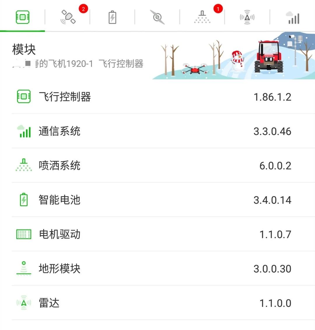 打开喷洒信息界面:点击自检,等待检测完成。完成检查后关闭电源,检查螺旋桨,准备试飞。注意,升级喷洒系统固件后,需重新校准喷洒系统。