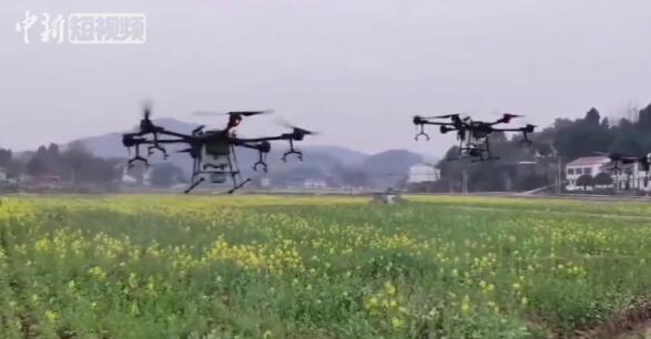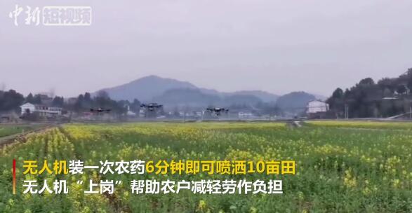 2020年2月24日,在四川南充西充大石坝村的西充县义青观十万亩优质有机粮油基地内,无人机为基地产业以水稻、油菜、小麦等有机粮油洒药、施肥。现在无人机装一次农药6分钟就可喷洒10亩田,无人机“上岗”,帮助农户实现了机器换人,减轻劳作辛苦,节约投入成本,和传统的人工喷药相比,无人机喷洒农药具有喷药效率高、防治效果更好、综合成本更低、遥控操作更安全等优势。