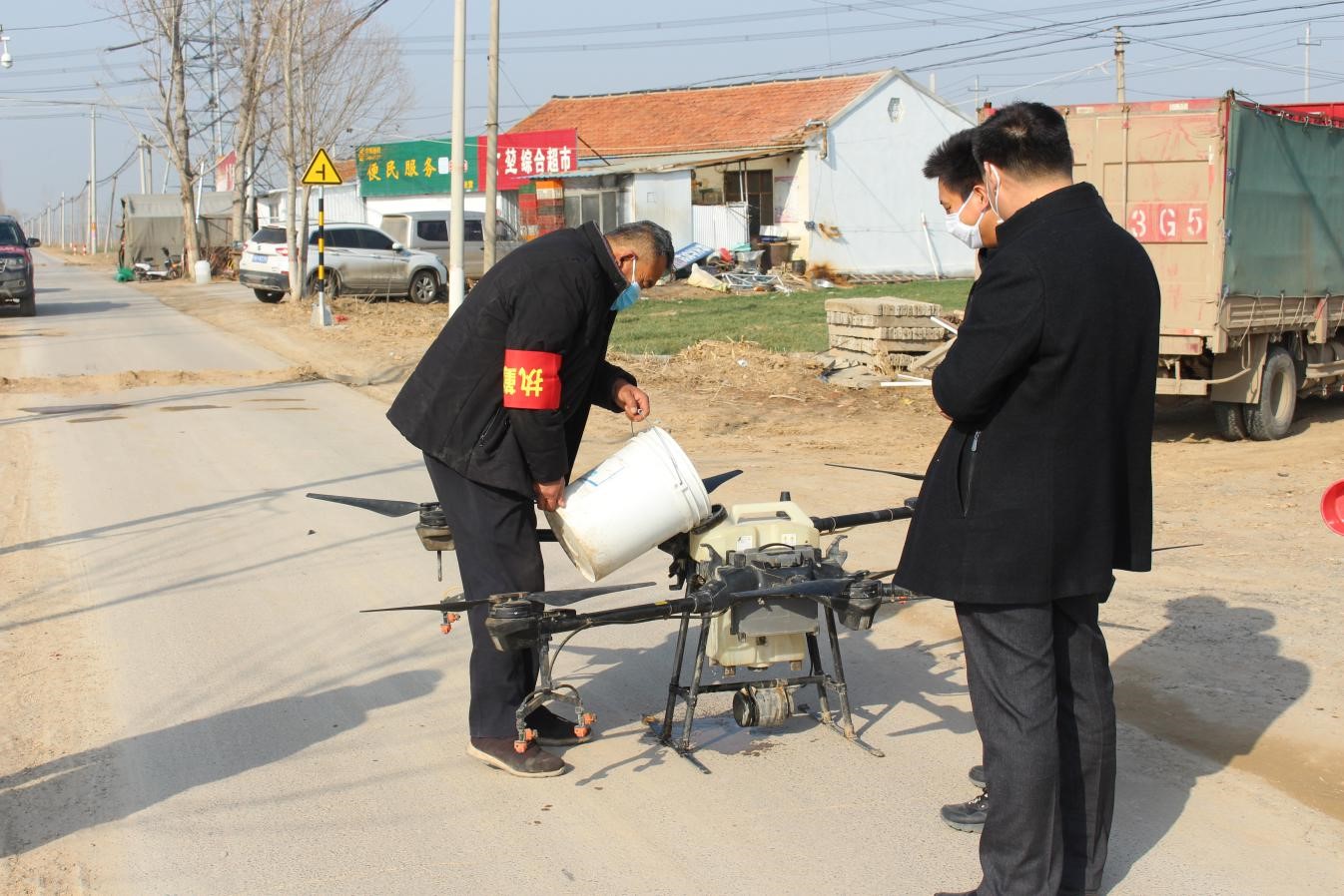 “起飞了、起飞了,太好了,真想不到,这么大的风还能正常飞防作业,既省力,又安全。”2月23日下午,山东德州市临邑县供销社鑫供公司的工作人员正在用无人机为临邑镇李仙台村进行空中疫情飞防消杀作业,李仙台村支部书记陈其东激动地说。