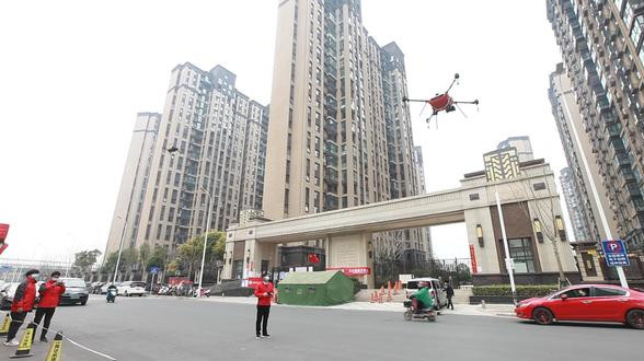 2月24日,在郑东新区双湖花园小区,一架来自河南经贸职业学院的无人机在小区上空利用机载喇叭一遍遍通知:各位居民请注意,本小区今日进行无人机免费消毒喷洒作业,大约需要30分钟时间,请大家关好门窗,收好衣物,不要出门。