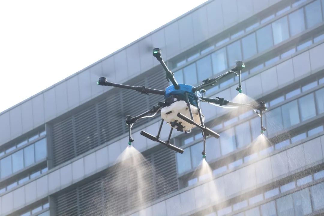 无人机喷洒消毒液,相对于人工地面喷洒,面积更广、效率更高,也直接避免了人员密集接触可能带来的疫情传播。
