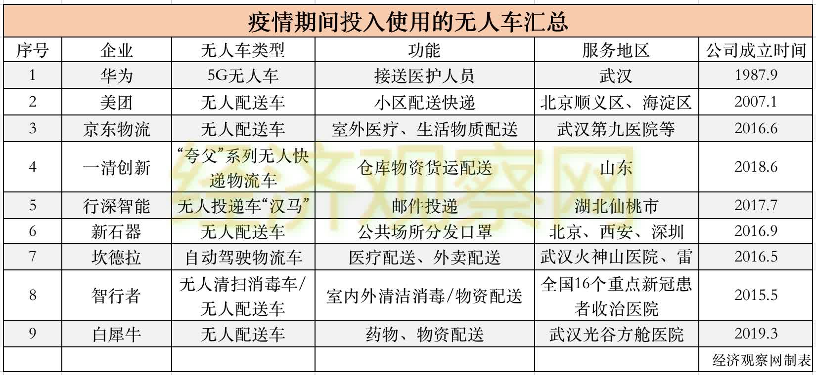 另外,上述这些专注于无人车领域的企业,大都处于起步阶段。除去华为、京东、美团外,其余几家公司均在5年内成立。其中,专注于物流配送的无人驾驶公司白犀牛,在2019年刚刚成立。疫情期间,这些公司的无人配送车、机器人出现在各疫区,才开始被越来越多的人知道。