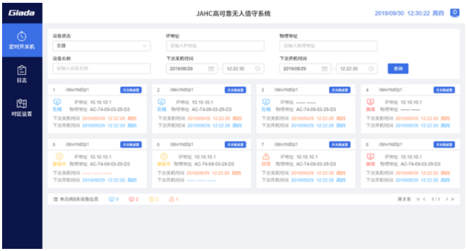 在原有功能的基础上,JAHC3.0版本新增了APP客户操作端,管理人员可通过操作界面查看设备的登陆状态,运行时的在线、离线、修复和异常状态、设置设备的定时开关机时间等。APP客户操作端不仅有利于实现批量设备的统一管理,节省设备的维护检测时间,还能够实时管控设备的运行状态,可有效杜绝因偶发或其它不可控事件造成的意外成本。