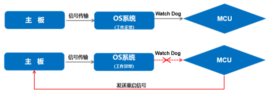 OS系统定时向MCU发送数据包来监测设备是否正常运行,若运行异常,MCU未接收到数据,则会发送重启信号给主板。