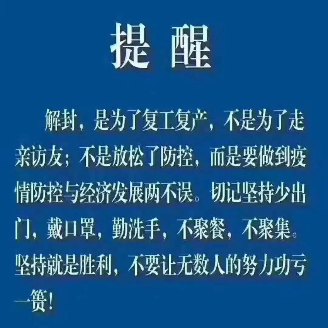 取消封闭式管制是为了方便通行开展生产复工,不是疫情结束一级响应并没有解除,仍需慎重出行,减少不必要外出,严禁聚集、聚餐、聚会,敬畏生命,出门请佩戴好口罩,继续做好疫情防控工作。