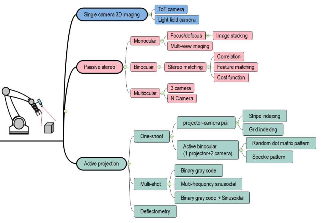 在智能制造领域,机器人视觉主要被用来代替人工视觉和拓展人工视觉的功能,高效、快速、准确地完成测量、检测、识别、定位等任务,而这些任务的实现都是基于二维或三维视觉成像完成的。合肥工业大学卢荣胜教授课题组针对智能制造领域机器人视觉感知中的三维视觉成像技术进行了综述,系统地总结了一些有代表性的机器人视觉成像方法的特点,探究了机器人三维视觉成像技术的发展趋势。