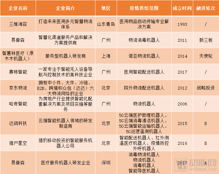 为疫情做贡献的物流机器人企业(资料来源:动脉网根据公开资料整理)