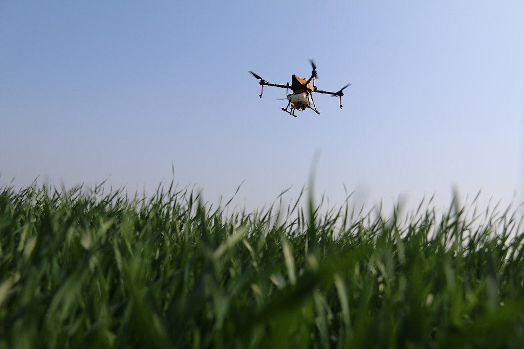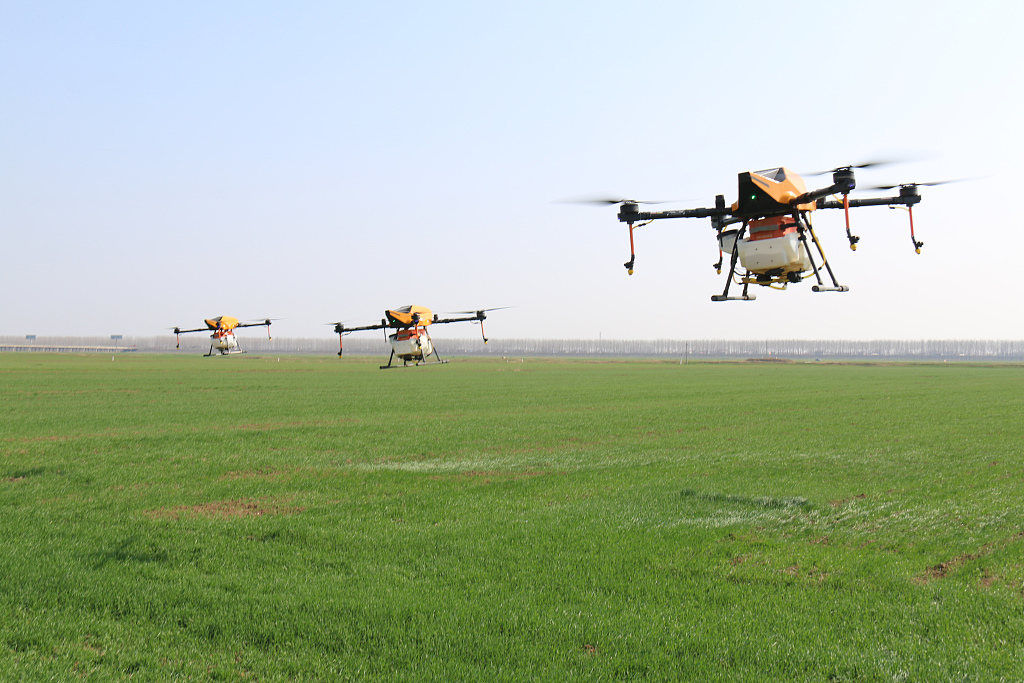 2020年2月27日,江苏省连云港市灌云县南岗镇,植保无人机在麦田里进行喷药作业。图片来源:视觉中国2020年2月27日,江苏省连云港市灌云县南岗镇,植保无人机在麦...