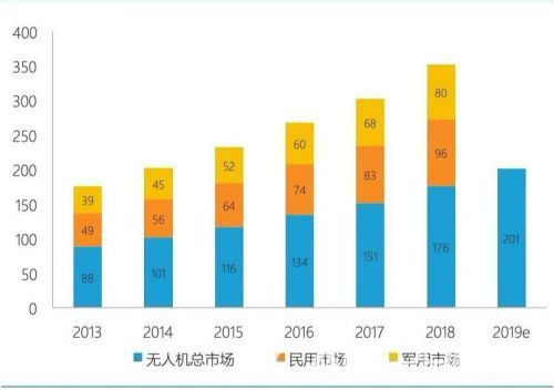 2013-2018年无人机市场增长情况(2019年为预计,单位:亿元)