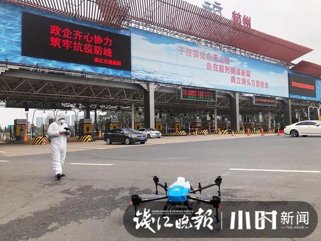 “准备,1、2、3,起飞!”今天(2月27日),一台无人机在省交通集团沪杭甬高速杭州收费站上空飞翔,并进行防疫喷洒作业。