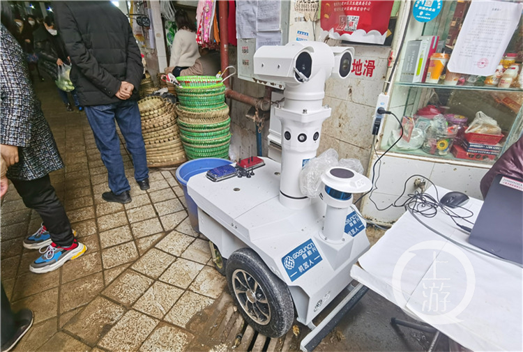2月20日开始,一台一米多高、搭载有5个高清摄像头和4个轮胎的智能机器人在九宫庙菜市场投入投用。它被安置于菜市口的出入口位置,市民只要从它面前一米左右走过,就能完成对体温的检测。