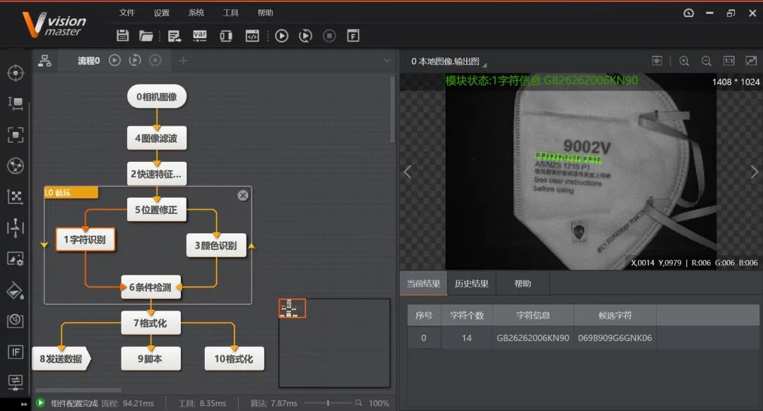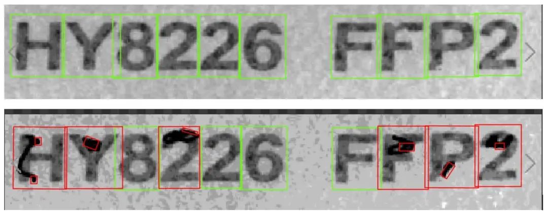 检测项:字符缺陷检测——使用字符缺陷检测工具,将待检字符边缘与模板比对,能够识别出字符喷印不合规的部分。
