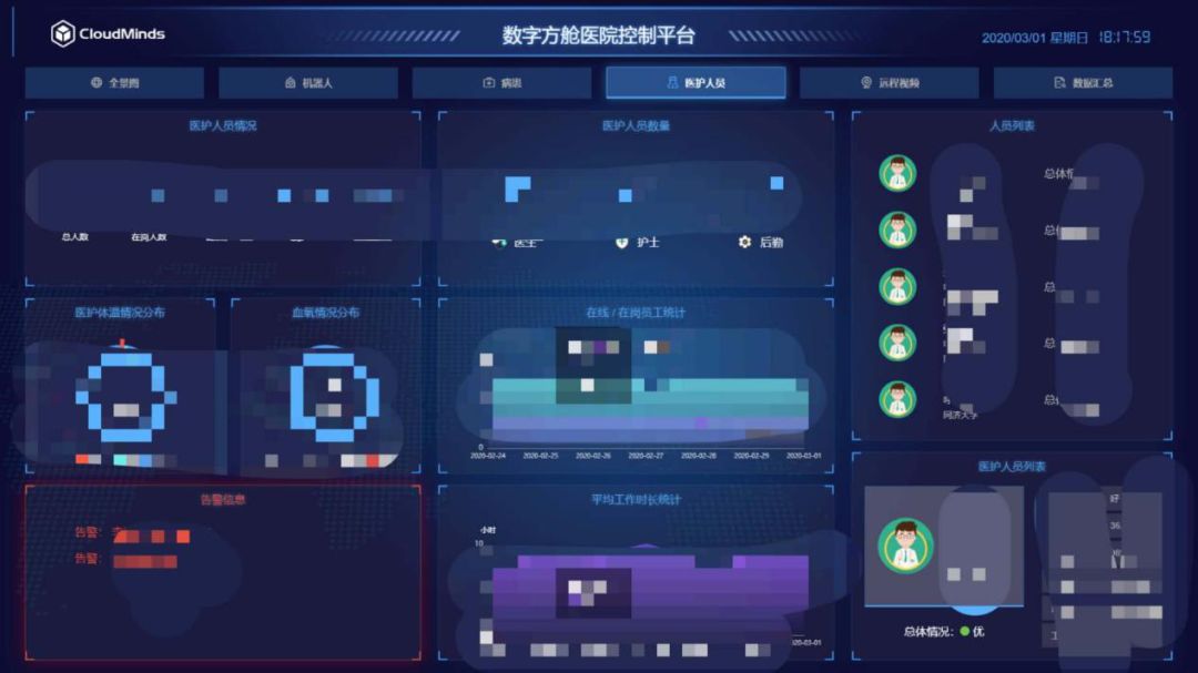 在设备陆续进场的过程中,达闼科技最新开发的医情监控运营系统逐步对接机器人HARIX云端大脑、医院HIS系统和第三方IOT系统。监控系统可以实时监测方舱患者数据,与智能机器人进行远程视频监控通话,展示医护人员数据及机器人状态,全景图式的工作分区让监测变得简单高效。