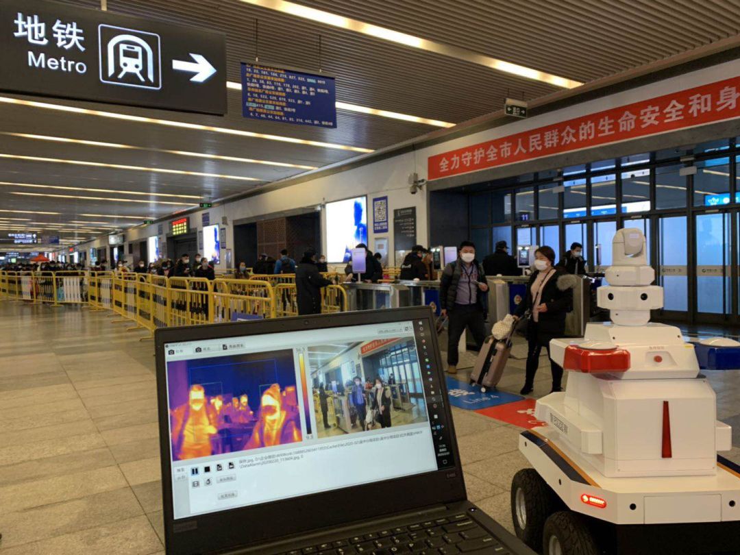 在苏州市火车站,中国联通为苏州市公安局提供AI+5G防疫机器人,助力疫情期间旅客出入口的检疫排查工作。该机器人可自主巡逻并通过装载的热成像测温设备对流动旅客进行移动测温,并发出高温报警。同时,通过高清摄像机可对未佩戴口罩的旅客进行实时提醒。