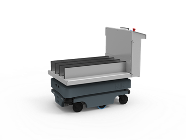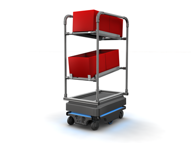 货架将MiR机器人变成自动物料搬运车,从而优化内部物流。货架可以设计成各种用途,从小型箱式物料车到大型提袋式物料车。