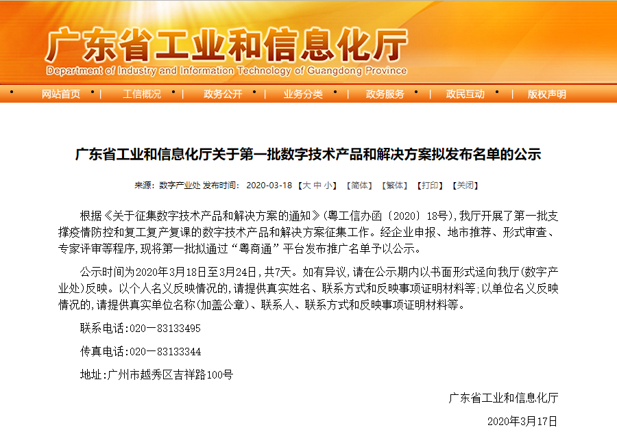 为贯彻落实国家最高领导人关于“鼓励运用大数据、人工智能、云计算等数字技术,在疫情监测分析、病毒溯源、防控救治、资源调配等方面更好发挥支撑作用”的重要讲话精神,广东省工业和信息化厅发布《广东省工业和信息化厅办公室关于征集数字技术产品和解决方案的通知》(粤工信办函〔2020〕18号,以下简称《通知》)要求,面向广东省内人工智能、大数据、互联网+等数字产业企业和相关科研院所,开展人工智能、大数据、互联网+等数字技术产品和解决方案征集工作。