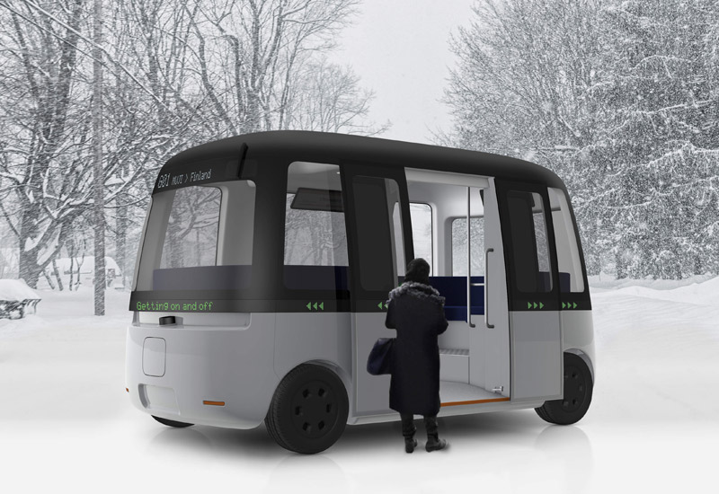Gacha是无人“摆渡车”,据称是首款可在全天候条件下运行的全功能电动自动巴士。该车具备无人驾驶能力,配置了精准导航和定位系统以及障碍物探测设备,以确保安全。Gacha长4.5m,宽2.4m,高2.8m-可以容纳10位乘客(6位成人)。这款四轮驱动全电动自动驾驶汽车最高时速可达每小时40公里(25英里),此外,电动机的续航里程为100公里(62英里),并且可以选择提供无线充电。巴士座位遵循公交车柔软的圆形方形形状。车舱友好的设计避免了典型的车辆将注意力集中在前部或后部。取而代之的是,LED灯带将整个车体包裹起来,提供前照灯和通讯屏幕的组合。机舱的设计是为了营造一个社交环境,Sensible 4的合作伙伴MUJI认为,像Gacha这样的自主驾驶的公共交通概念,极有潜力在极端的冬季将芬兰等偏远地区的居民聚集在一起。很显然,这款极简主义的自动巴士是世界上首个在所有天气条件下都能正常运行汽车。