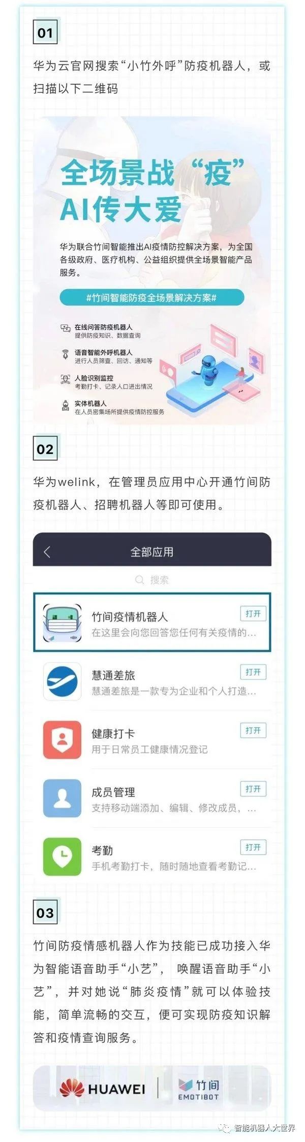 竹间防疫全场景解决方案接入服务,通过华为以下渠道均可使用万众一心,众志成城华为联合竹间智能防疫全场景解决方案,提升政府治理高效能,助力企业复工复产。