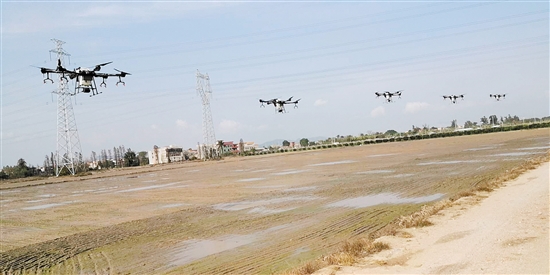 无人机、旋耕机、插秧机……日前,记者在开平市水口镇的农机种植示范田现场看到,空中,多架植保无人机实施播种和精量施药飞行作业;地面,旋耕机、水稻直播机等机械无缝对接,联合进行春播作业。借助农业机械化,很快就能完成平田、播种、洒药等一系列“春耕动作”。