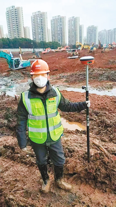孙见新在武汉火神山医院建设现场进行测量工作。千寻位置供图