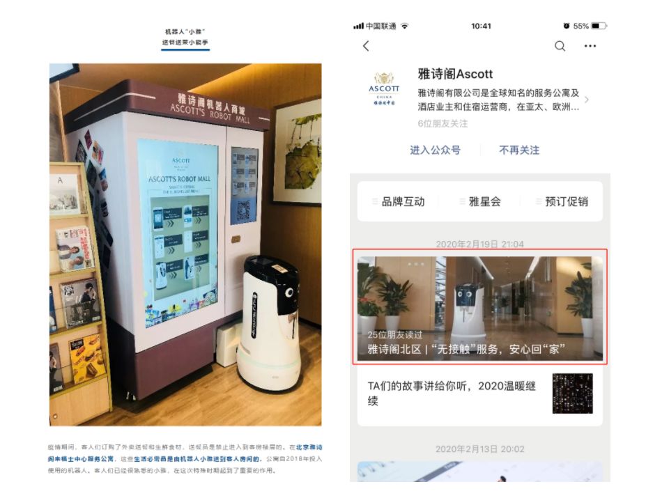 “小雅”不仅是送餐、送菜的小能手,疫情期间,客人们订购的外卖和生鲜食材、生活必需品配送也都是由“小雅”为客人提供服务的。“小雅” 出色的工作表现,也得到雅诗阁官方推荐与点赞。