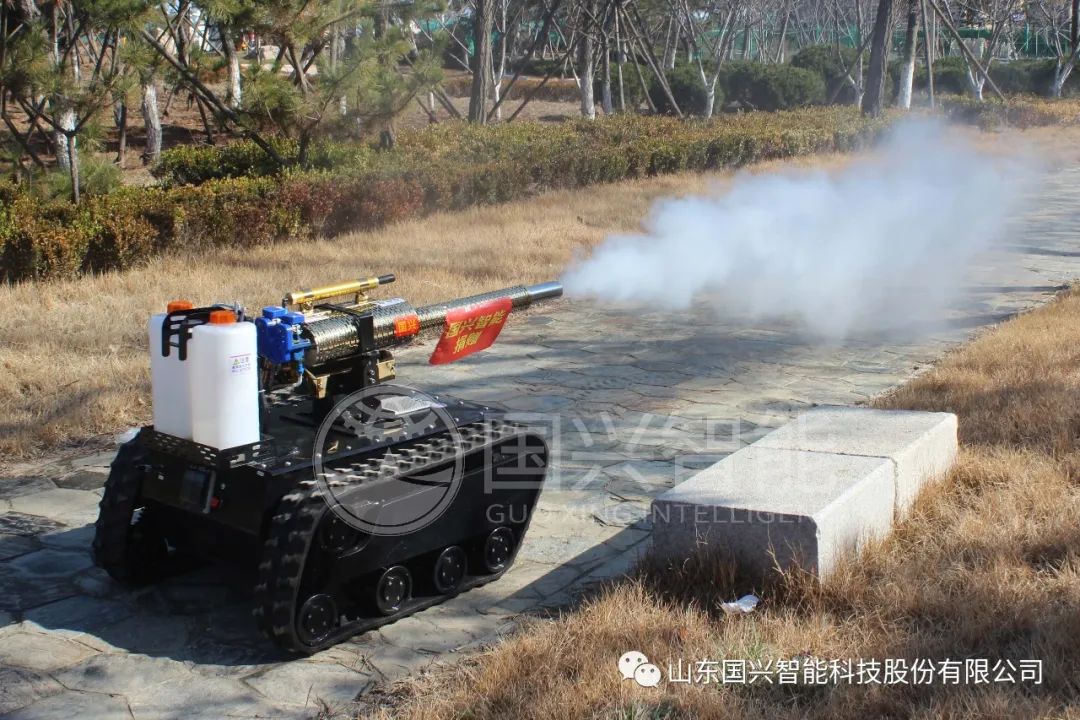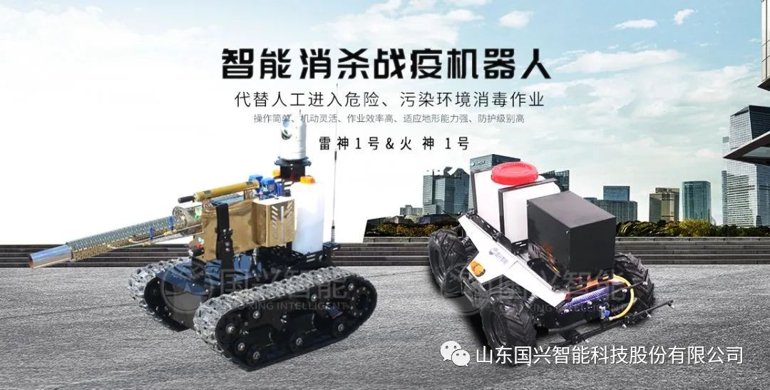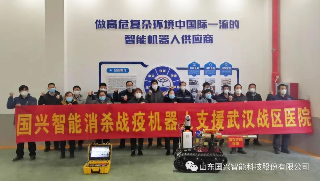 山东国兴智能科技股份有限公司是山东省的瞪羚企业,一直专注于特种机器人的研发、生产、销售。作为行业领军企业,秉承科技服务人类的理念,自疫情爆发就积极加入到了这场防疫大战之中。疫情爆发后,为助力疫情防控,保护一线防疫人员的安全,公司发动全部科研力量,凭借在特种机器人智能控制底盘领域的研发优势,争分夺秒的研制出了智能消杀战疫机器人“雷神”和“火神”。为了支援防疫工作,国兴智能承担其社会责任,捐赠2台消杀机器人给烟台开发区管委用于在辖区内开展消杀工作,并捐赠1台消杀机器人给武汉战区医院用于院区消杀工作,努力让机器人到最需要的地方贡献力量。