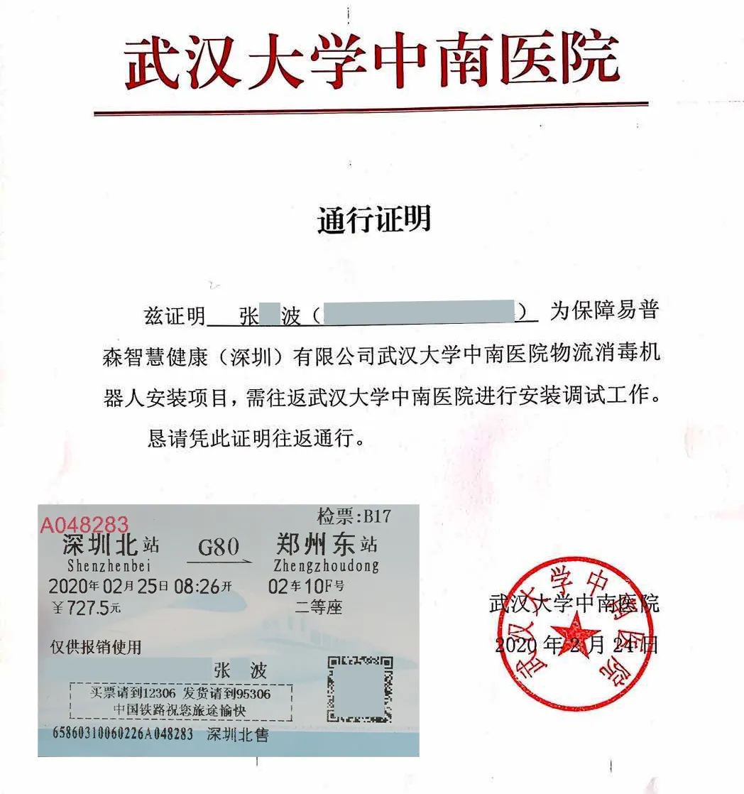 2月24日,易普森实施部工程师收到了去往武汉的通行证明,前往医院进行机器人安装调试工作,一张平时看似普通的车票,此时此刻让易普森全体员工充满了敬意,壮士出征,定会凯旋归来!从疫情发生到现在,为了确保及时的服务,易普森全体工程师始终坚守在一线,为疫情防控提供坚实的后盾力量。
