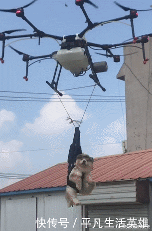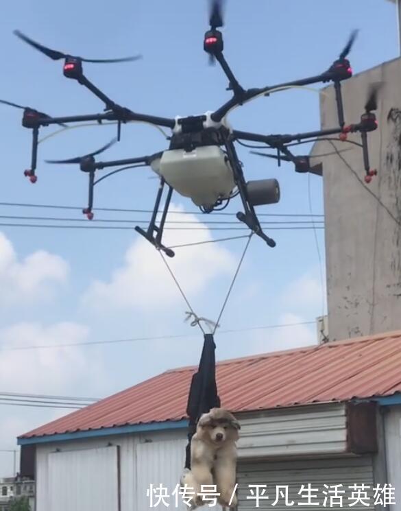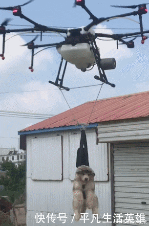 感觉狗狗都快要吊下来了,主人把无人机不停的下降,高度降下来了,狗狗挣扎的力度就小了,现在狗狗感觉就只是一点东西吊着,有一种随时从上面摔下来的样子。