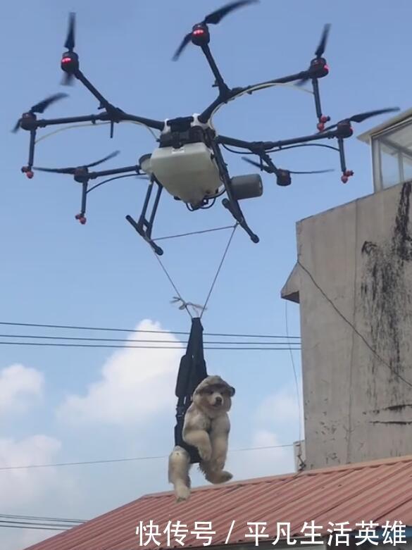 这架无人机挺大的,把狗狗给吊起来,那是一点困难度也没有,狗狗被吊起来的时候,也还算淡定,不过有时候也会挣扎一下,主人也不敢把无人机吊的太高。