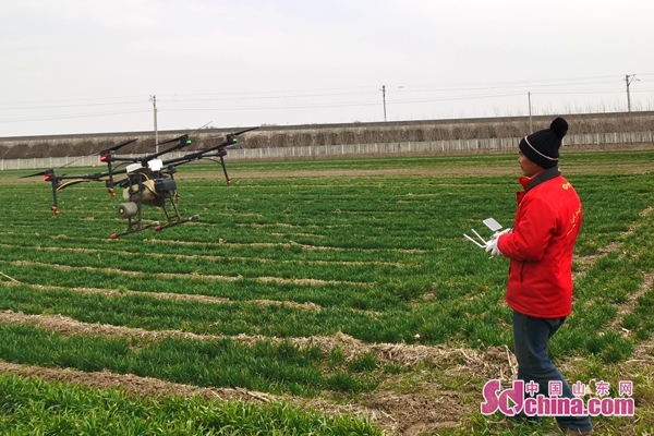 中国山东网3月9日讯3月9日上午,平度市田庄镇一片绿油油的麦田里,一架智能植保无人机正在进行施药施肥作业。据徐家村党支部书记李洪岩介绍,无人机的农药箱一次能装40斤药水,不到20分钟就能完成10亩地的喷药作业,效率比人工高出15倍。
