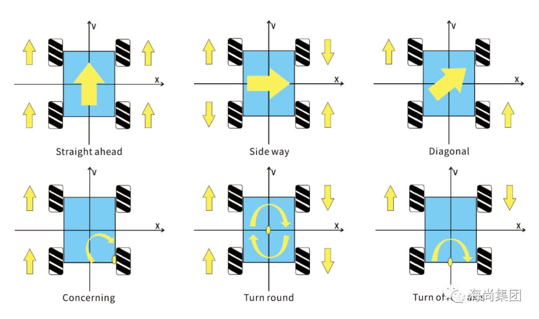 ●以麦克纳姆轮构建的全向平台,非常适合转运空间有限、作业通道狭窄的工作环境,可以在最狭窄的空间内,瞬时从静止状态沿任意方向,实现360度无死角的全向移动:前行、横移、斜行、原地旋转、前、后定点摆动等运动,如下图,并可精确移动至所需的位置上,定位精度最高±0.5mm。由此可形成在节省空间的同时具有最高精度的物流自动化解决方案。