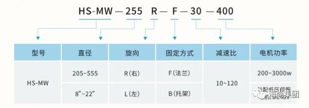 例:麦轮驱动模组,直径255,右旋,速比30,法兰式安装,配低压伺服电机48vDC,400w,则标记为: